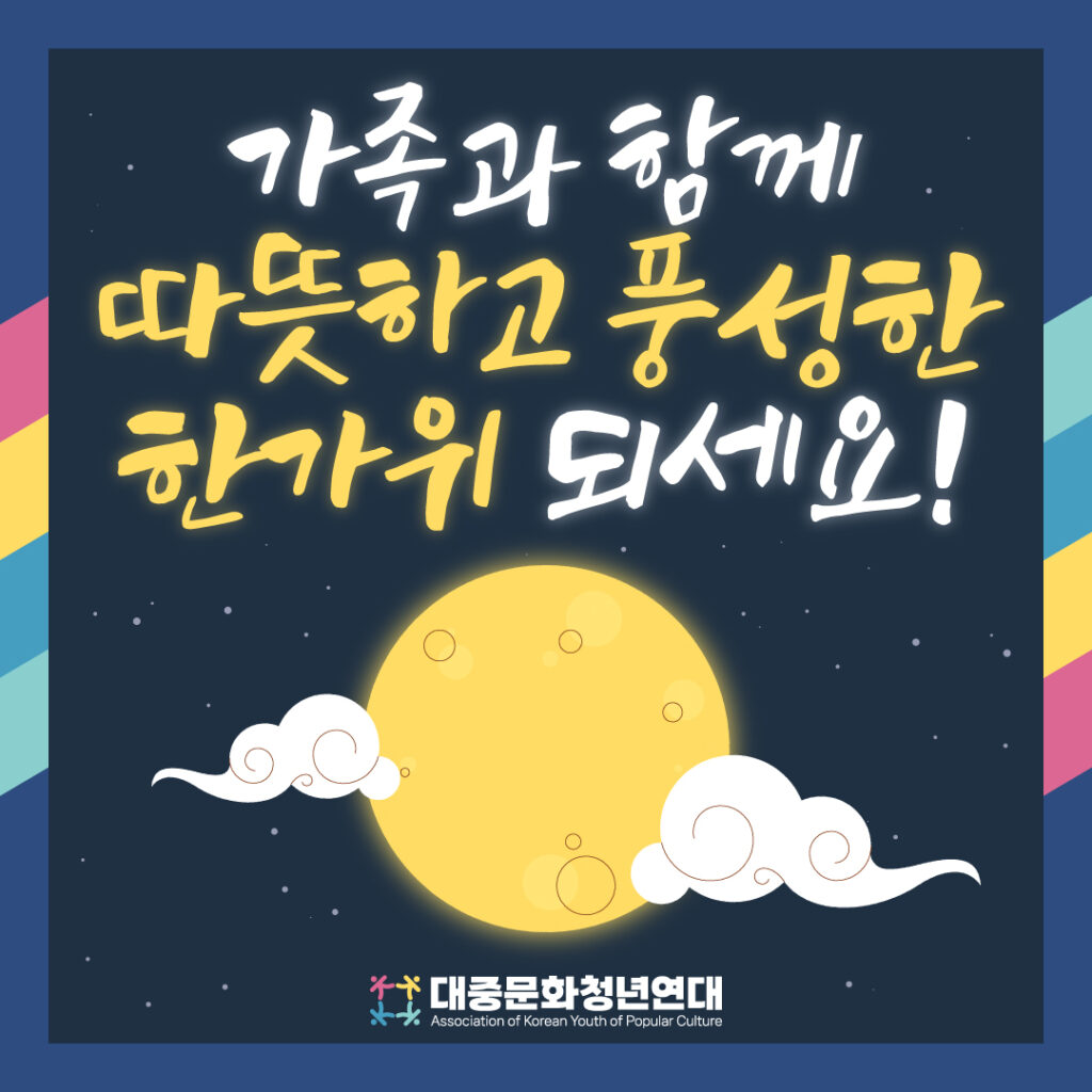 한가위를 맞아 회원 여러분과 가정에 평안과 풍요가 함께하시길 기원합니다. 대중문화청년연대는 청년과 문화의 동반 성장을…